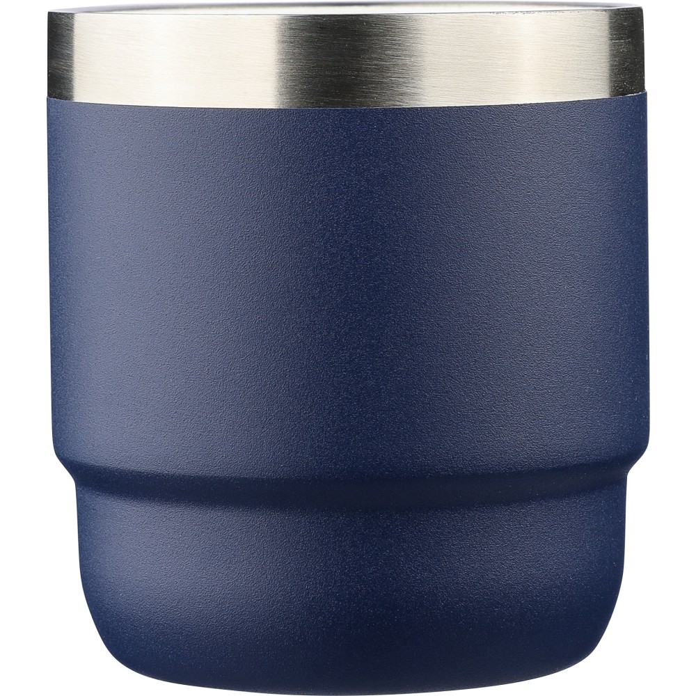 Újrahasznosított rozsdamentes acélból készült bögre (180 ml) duplafalú kialakítással, kerámia belső bevonattal és fogantyúval, a csészén lézergravírozott recycled (újrahasznosított) rozsdamentes acél alapanyagra utaló logó található, darabonként barna kartondobozba csomagolva.