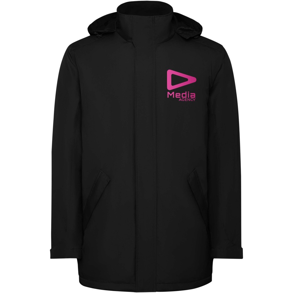 Vízálló bélelt parka férfiaknak. Magas gallérral és levehető kapucnival, tépőzáras záródással. Oldalsó zsebek cipzárral, belső zseb tépőzáras záródással. Állítható mandzsetták tépőzáras övhurkokkal. Belső hozzáférés a hátsó és a bal mellkasi megerősítésekhez.
