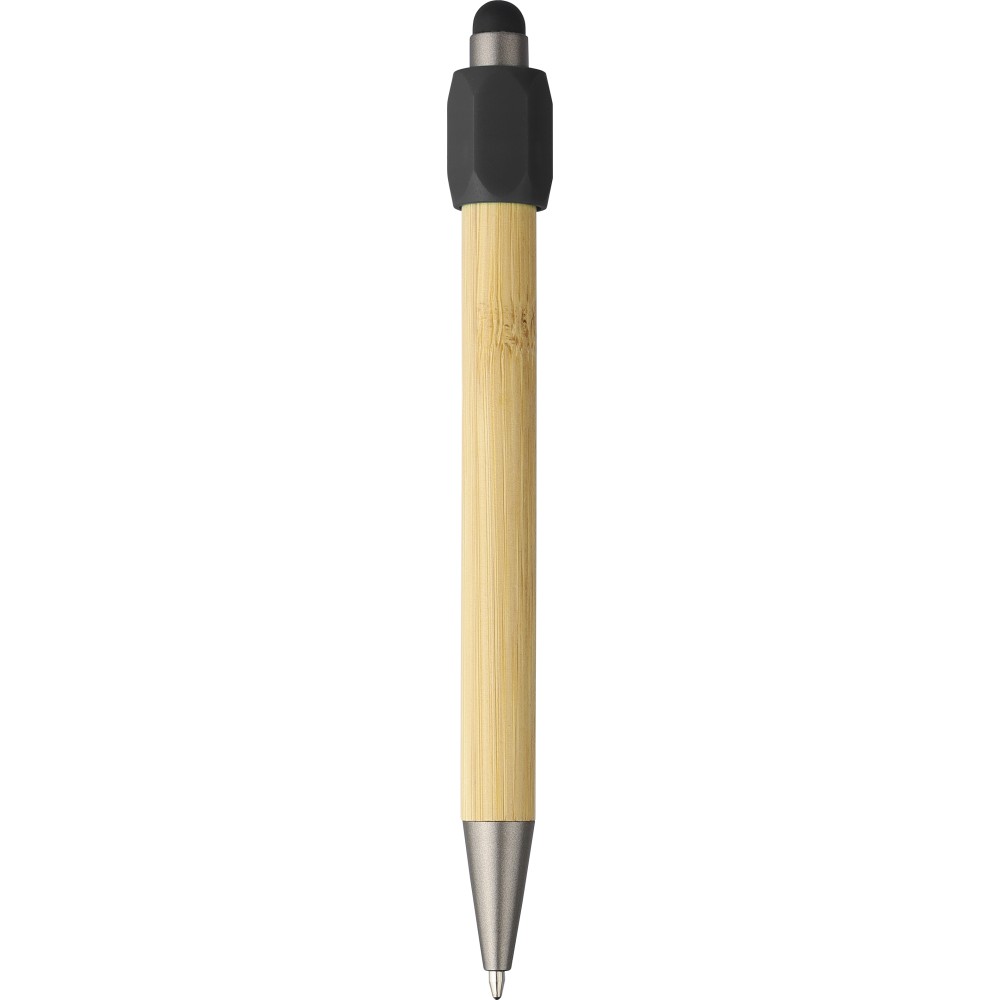 Bambusz golyóstoll újrahasznosított ABS pörgettyűvel és fekete érintővel a nyombógombon. A tollhegy vastagsága 1.0 mm, íráshossz: kb. 800 méter. Az újrahasznosított anyagra utaló logó a tollra van gravírozva.