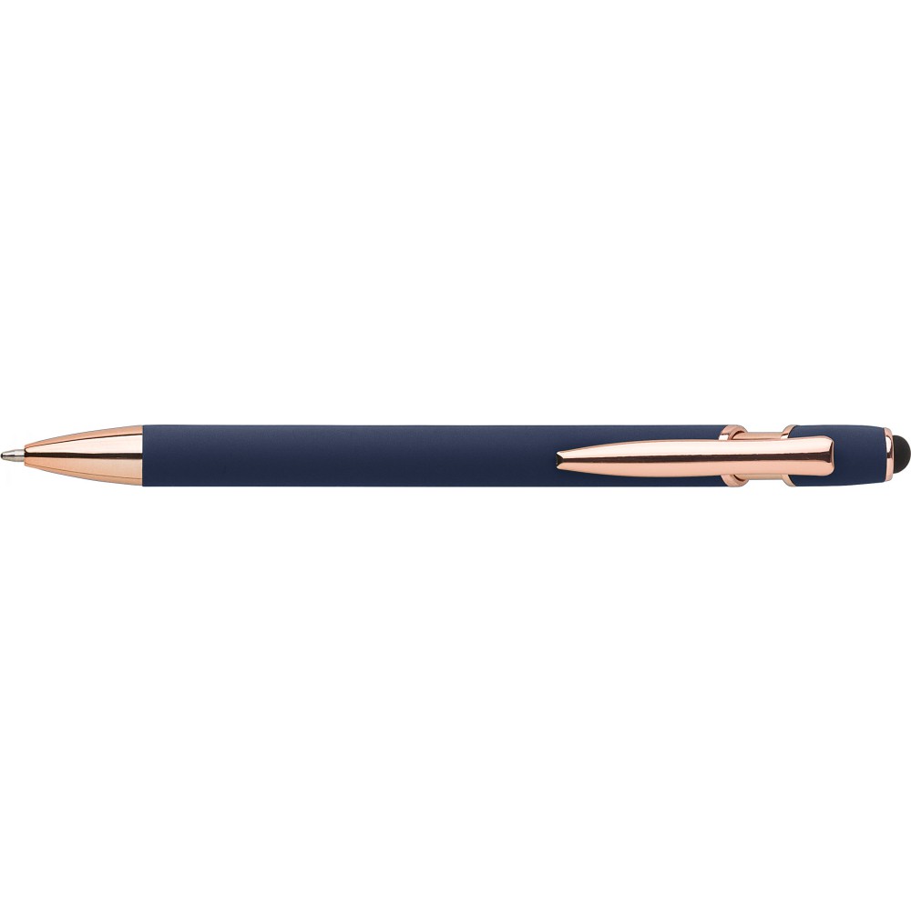 Alumínium golyóstoll rózsaarany részletekkel és érintővel, kék tollbetéttel.