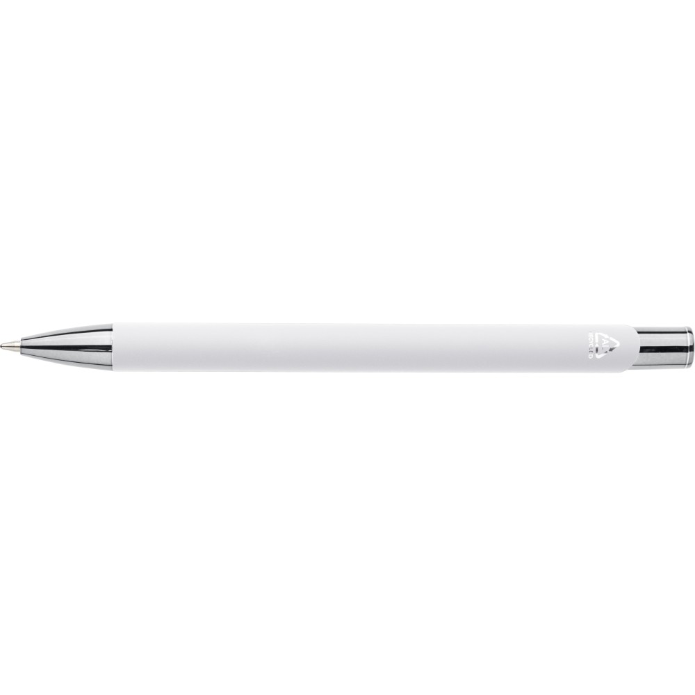 Újrahasznosított alumíniumból készült, gumírozott felületű golyóstoll, a toll színével harmonizáló UV-bevonatú műanyag és fém díszítéssel. Gravírozás után fényes tükörhatás jelenik meg. A tolltesten gravírozott recycled (újrahasznosított) alapanyagra utaló logó található. Megközelítőleg 800 méter íráshosszúságú, kék színű tollbetéttel.