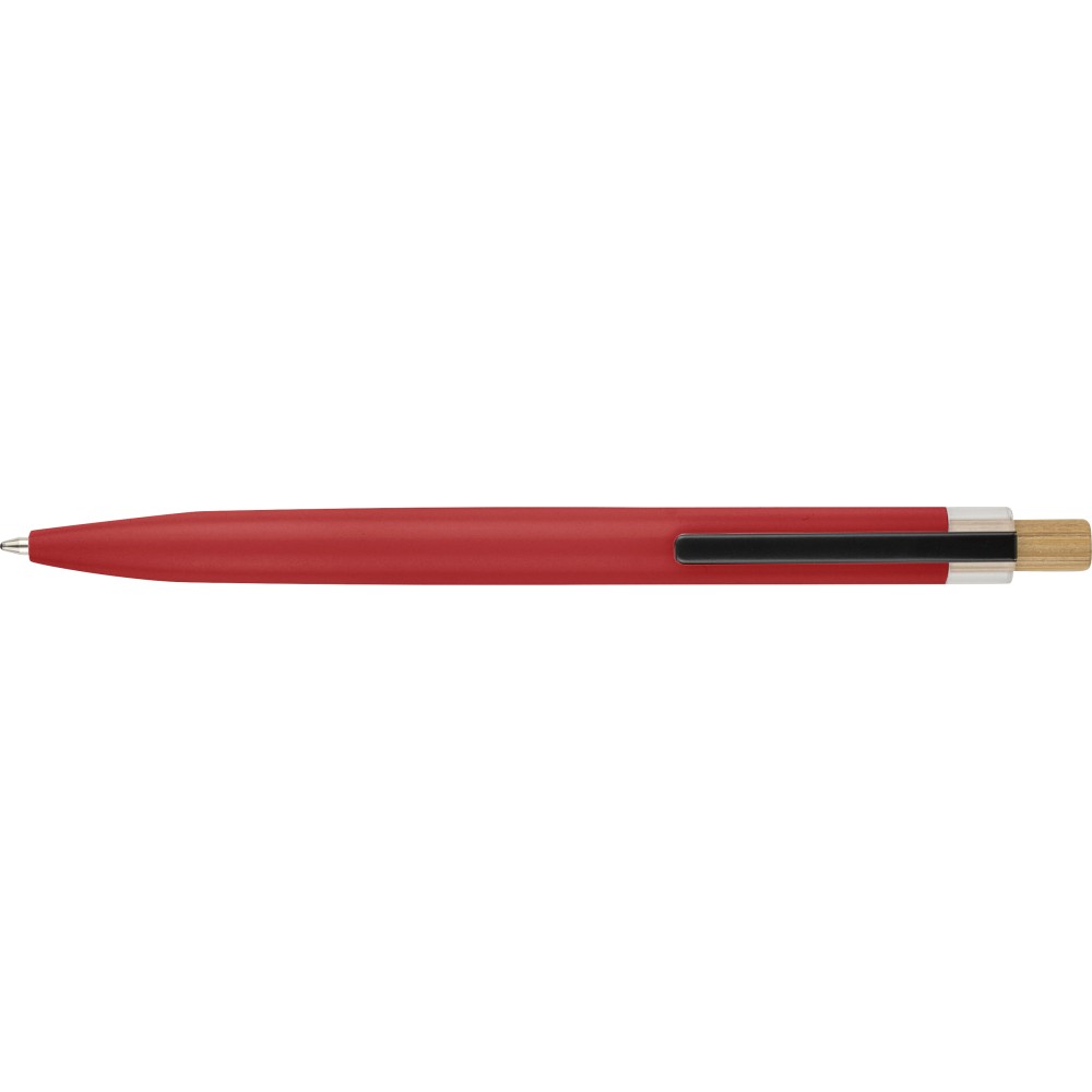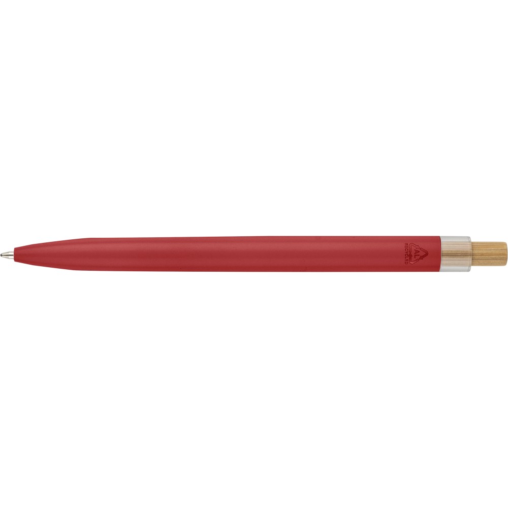 Újrahasznosított alumíniumból készült, lakkozott, nyomógombos golyóstoll bambusz nyomógombbal, rPET díszítéssel és fém klippel. A tolltesten gravírozott recycled (újrahasznosított) alapanyagra utaló logó található. Megközelítőleg 700 méter íráshossz, kék tollbetéttel.