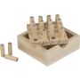 Fenyőfából készült mini Sudoku játék, felnyitható játéktáblával és belső tárolórekesszel 16 darab játéktüske számára. Kompakt kivitel, útközbeni használatra alkalmas. Darabonként barna kartondobozba csomagolva.