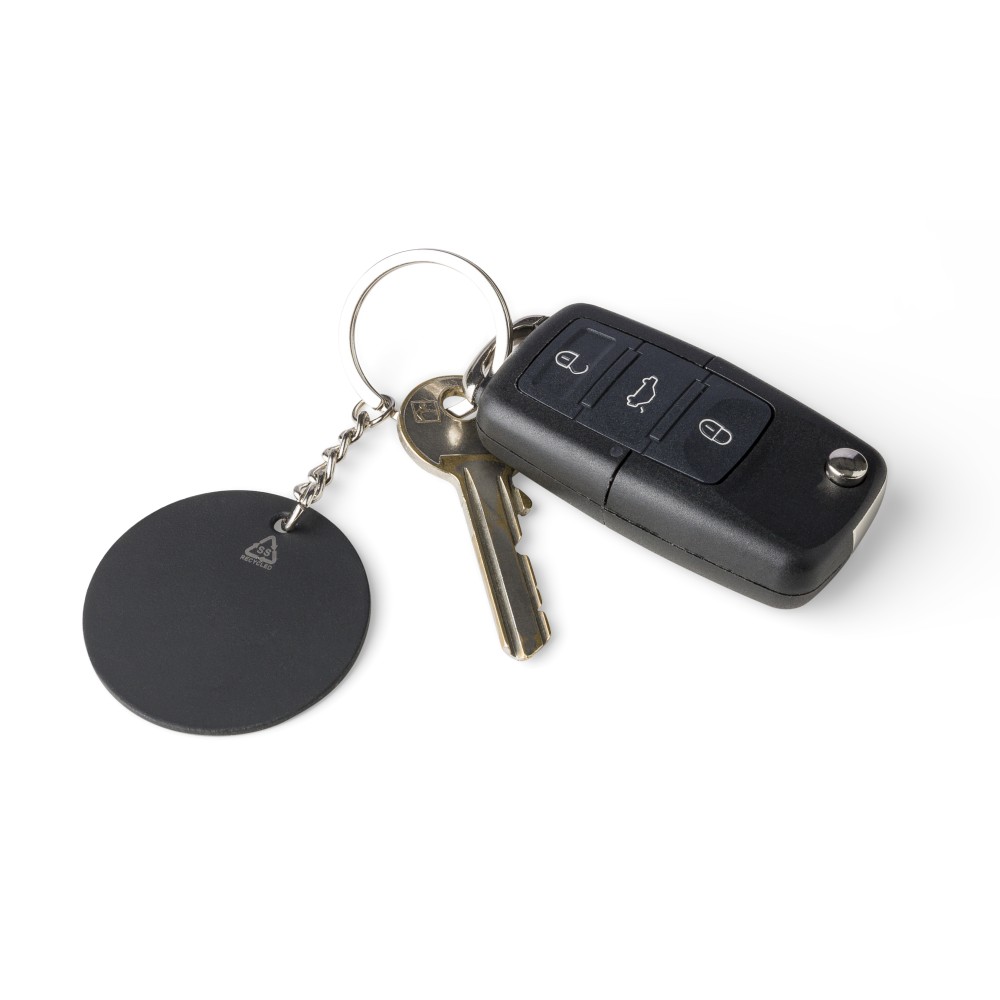 Újrahasznosított rozsdamentes acélból készült, gumírozott felületű, téglalap alakú kulcstartó fém karikával. A kulcstartón gravírozott recycled (újrahasznosított) alapanyagra utaló logó található, amely gravírozás után fényes, tükörszerű hatást mutat. Egyenként kraft papírtasakba csomagolva.