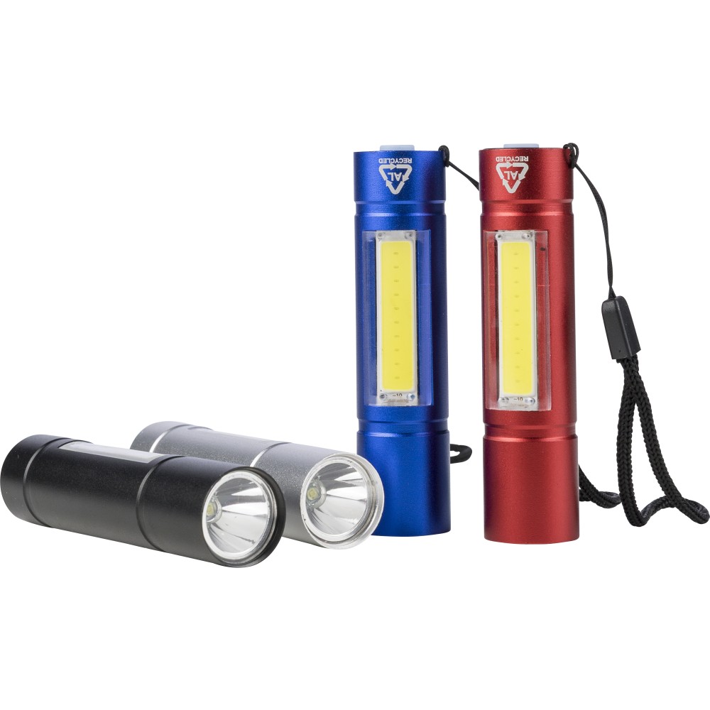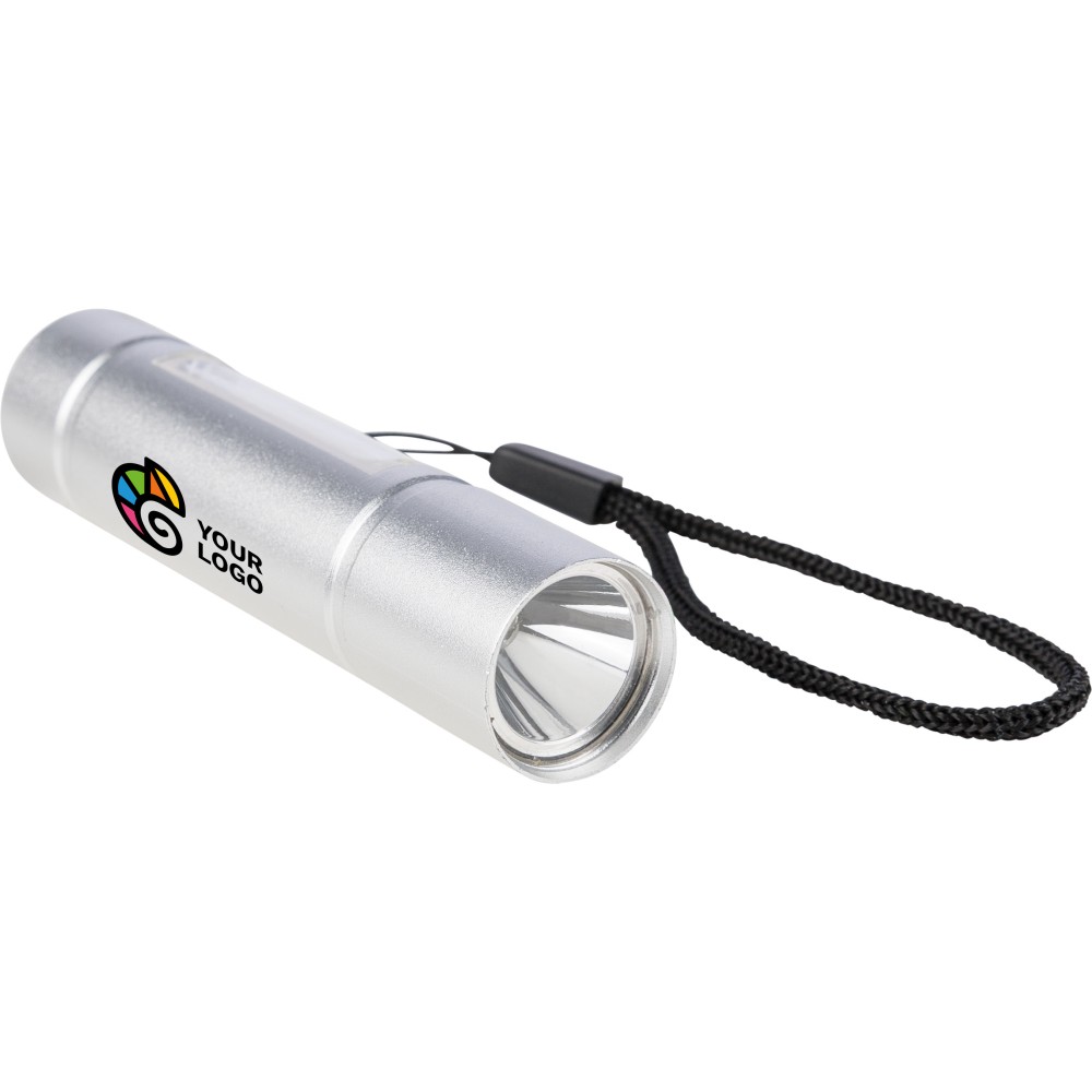 Újrahasznosított alumíniumból készült COB zseblámpa (80-100 lumen) 3 világítási móddal, nyomógombbal, csuklópánttal és gravírozott recycled (újrahasznosított) alapanyagra utaló logóval. USB-C-n keresztül újratölthető (300 mAh), a csomag része egy 30 cm-es kábel. Illusztrációval ellátott barna dobozba csomagolva.