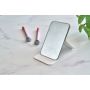 Üvegtükör összehajtható, újrahasznosított PU borítással, amely kinyitva álló helyzetben használható. A borításon dombornyomott, újrahasznosított alapanyagra utaló logó található. Papírtasakba csomagolva.