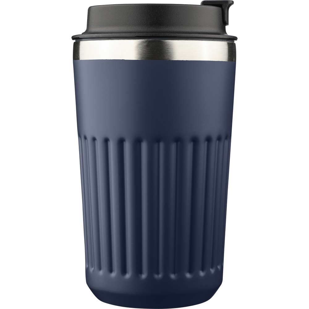Újrahasznosított rozsdamentes acélból készült utazópohár 400 ml űrtartalommal, duplafalú kialakítással és külső bordázott felülettel. Belső része 304-es, külső része 201-es rozsdamentes acél, PP fedéllel. A pohártesten gravírozott recycled (újrahasznosított) alapanyagra utaló logó található. Darabonként barna kartondobozba csomagolva.