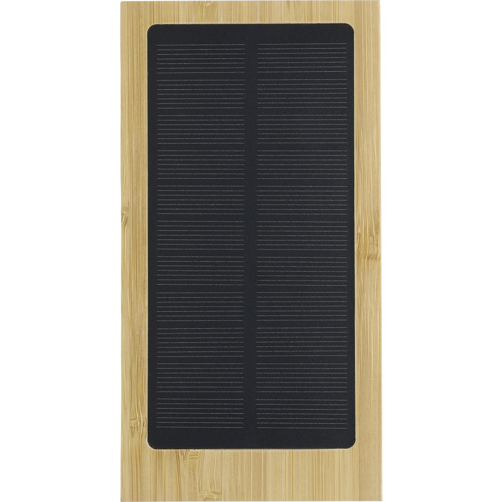 Bambusz napelemes powerbank 10.000 mAh kapacitással, dual USB-A és USB-C porttal, vezeték nélküli töltés funkcióval, beépített napelemes panellel és 5 db LED jelzőfénnyel. 30 cm-es fehér kábel tartozik hozzá. Csomagolása barna papírdoboz.