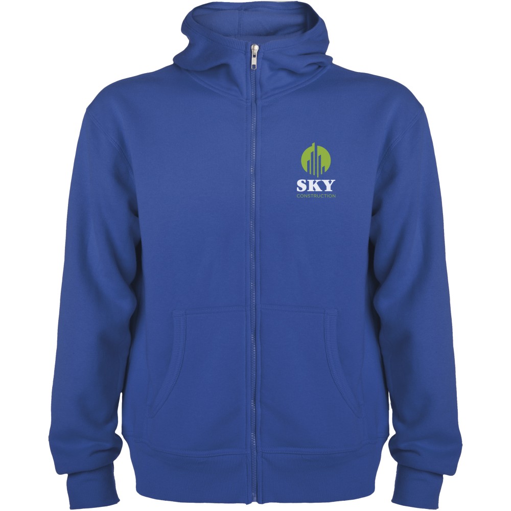 Magasnyakú, kapucnis pulóver teljes cipzárral. Bordázott részletek a kapucni és a zsebek szélén. Kenguru stílusú zseb. 2x2-es bordás kézelő és nyakpasszé. Gyerekméretekben is kapható. 50% pamut és 50% poliészter, 280 g/m2.