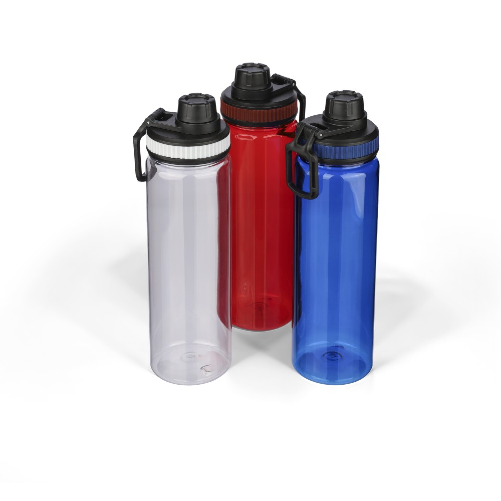 RPET anyagból készült ivópalack PP kupakkal, amely hordozófüllel és csavaros záródással rendelkezik, valamint a palack áttetsző testének színével harmonizáló szilikon díszítéssel. Űrtartalma 750 ml.
