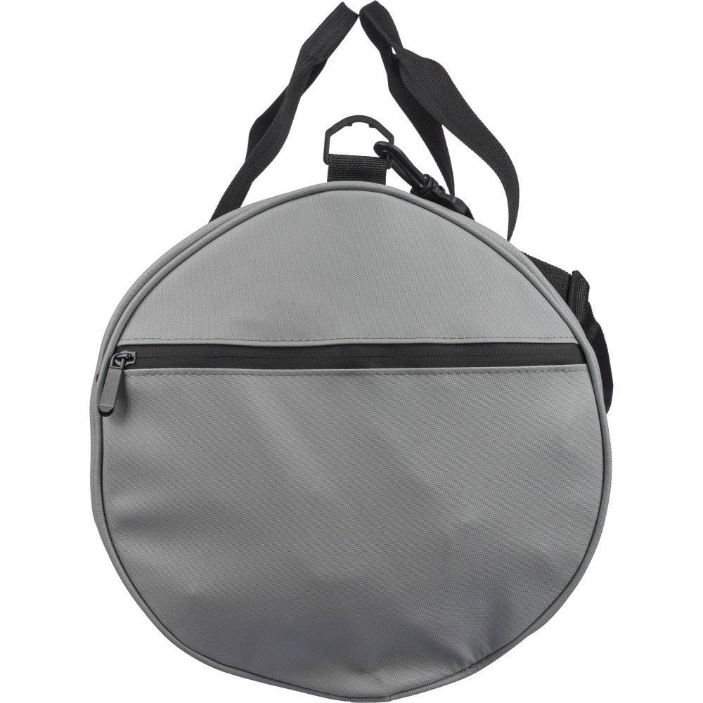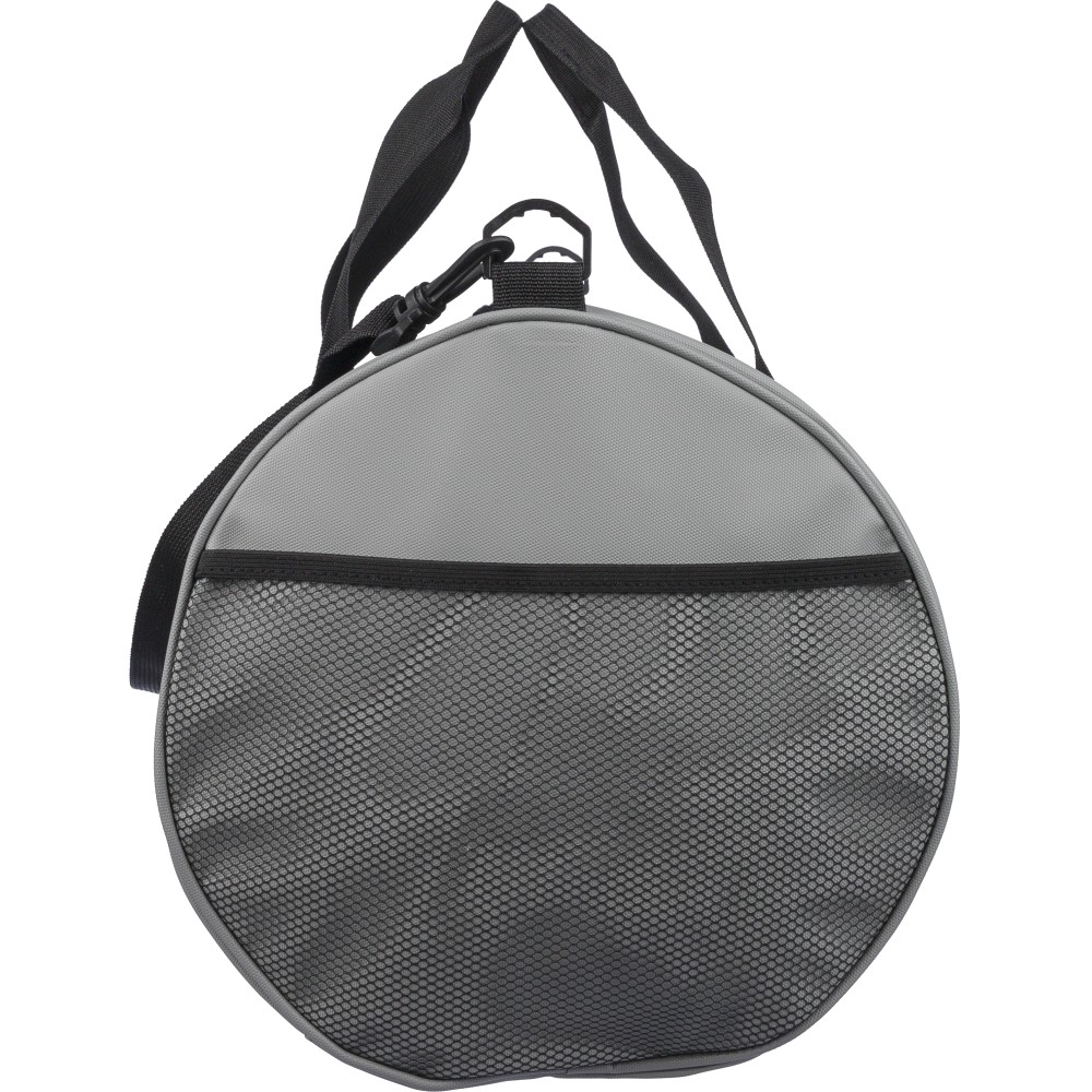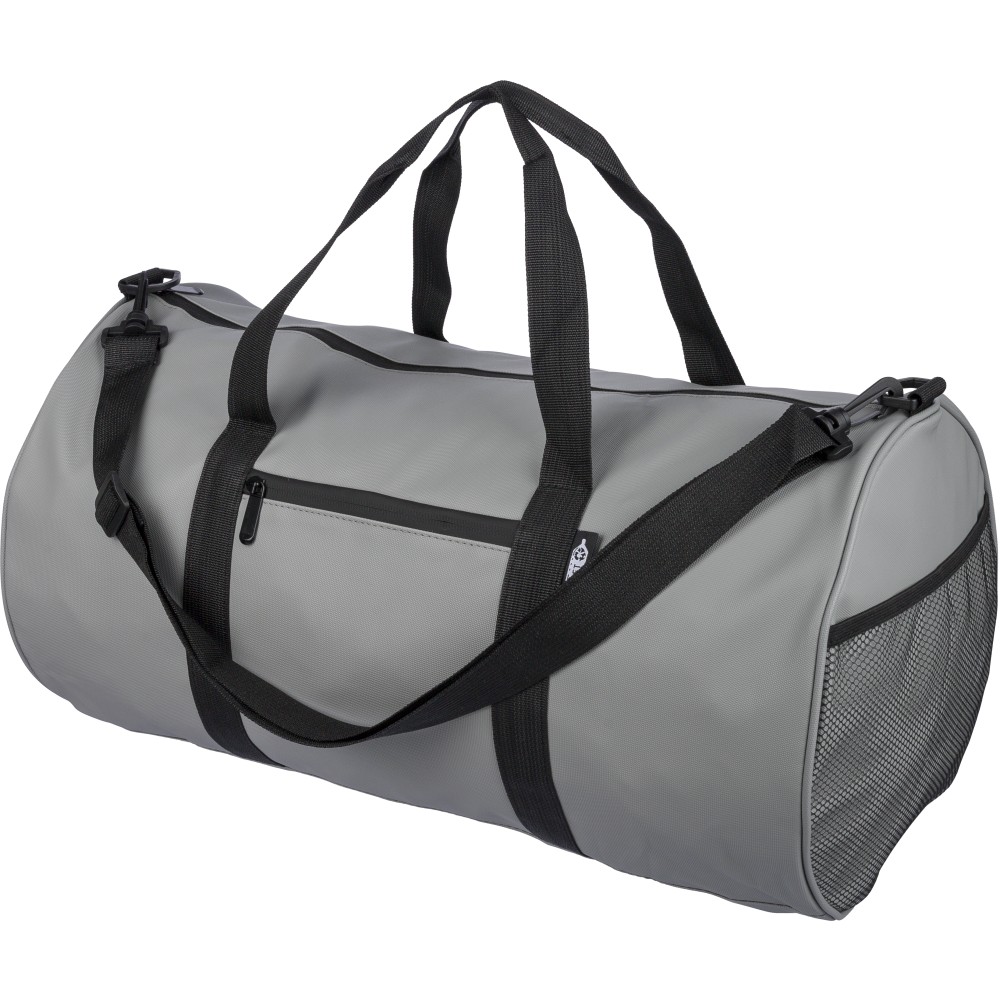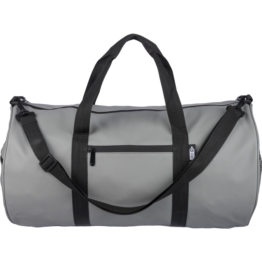600D poliészterből készült rPET sporttáska 210D béléssel és vízlepergető PU bevonattal, 40 literes űrtartalommal. Elülső és oldalsó cipzáras zsebbel, hálós oldalzsebbel, két fogantyúval és állítható vállpánttal rendelkezik. Külső felületén rPET címkével ellátva.
