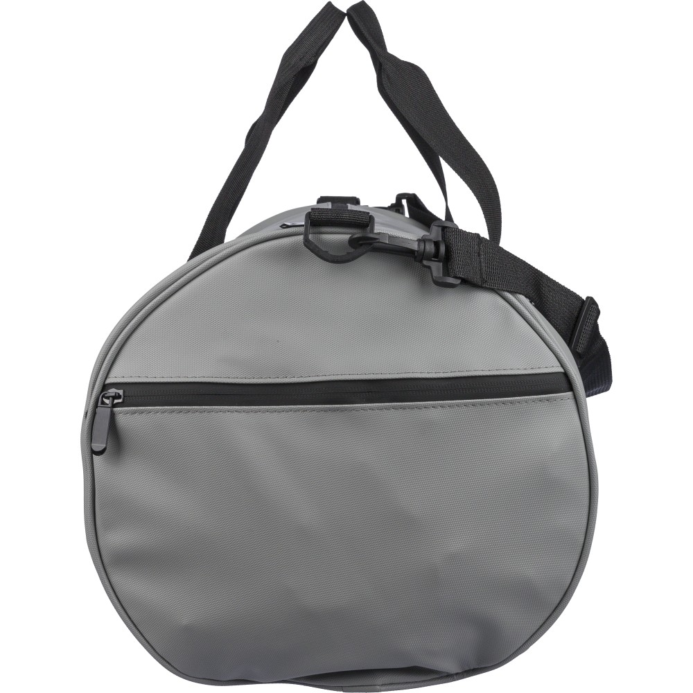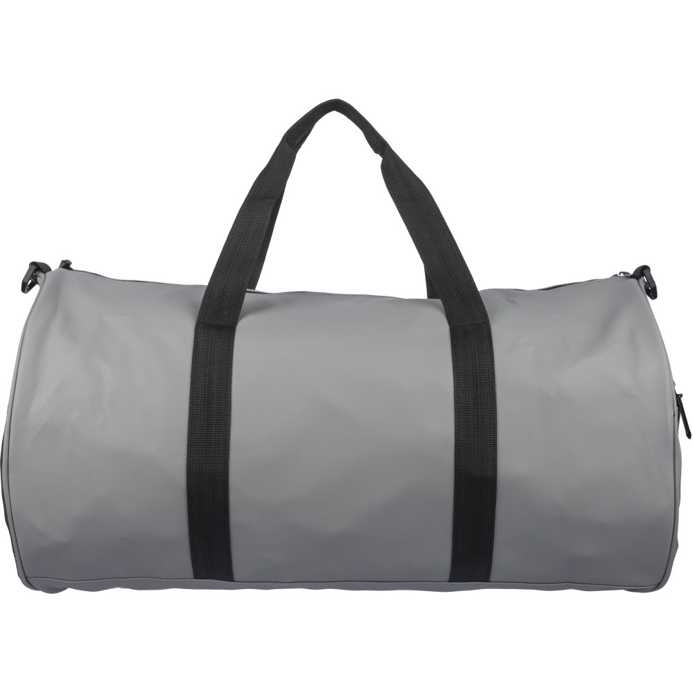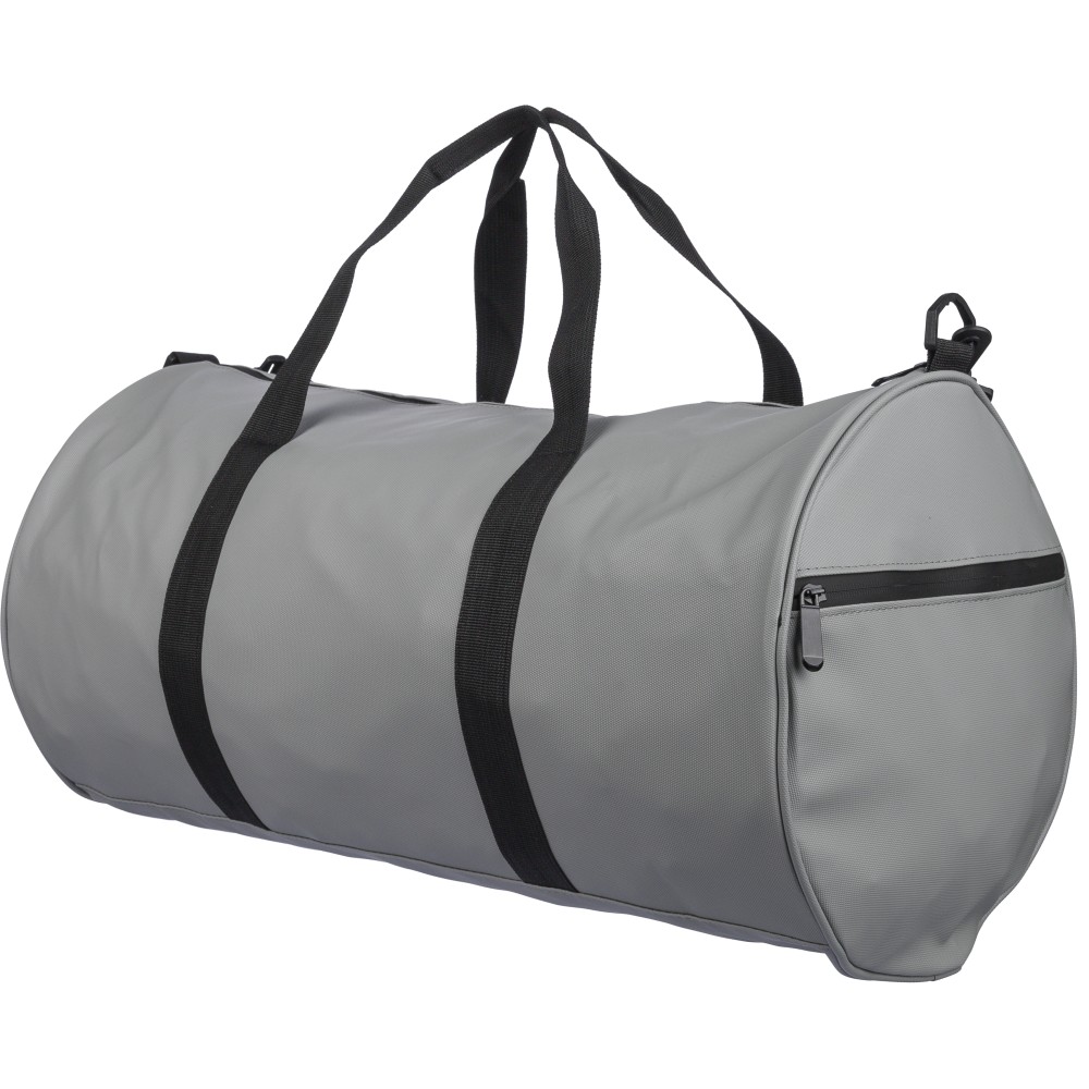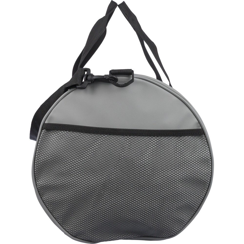 600D poliészterből készült rPET sporttáska 210D béléssel és vízlepergető PU bevonattal, 40 literes űrtartalommal. Elülső és oldalsó cipzáras zsebbel, hálós oldalzsebbel, két fogantyúval és állítható vállpánttal rendelkezik. Külső felületén rPET címkével ellátva.