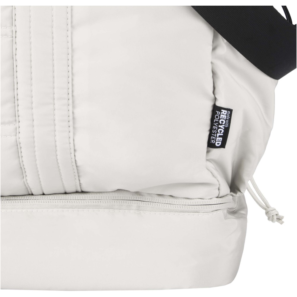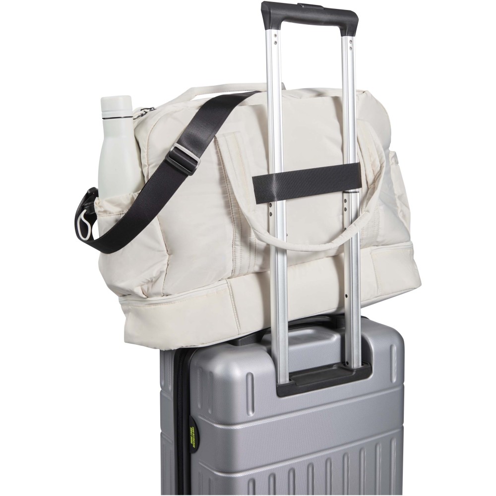 A Puffer sporttáska egyedi megjelenést ötvöz prémium minőségű, GRS tanúsítvánnyal rendelkező újrahasznosított alapanyagokkal, így ideális választás a mindennapi használathoz. A 30 literes űrtartalom tökéletes rövid utazásokhoz, edzéshez vagy hétköznapi teendőkhöz. A táska tágas, cipzáras fő rekesszel rendelkezik ruhák és felszerelések számára, valamint egy szigetelt, PEVA bélésű alsó rekesszel, amely lehetővé teszi a nedves és száraz holmik elkülönítését. A több belső és külső zseb segíti az átlátható rendszerezést, míg a bőröndre rögzíthető pánt, az állítható vállpánt és a kézifogantyúk sokoldalú hordozási lehetőséget biztosítanak. Könnyű és vízlepergető kialakításának köszönhetően ez a sporttáska könnyedén alkalmazkodik az életviteledhez.