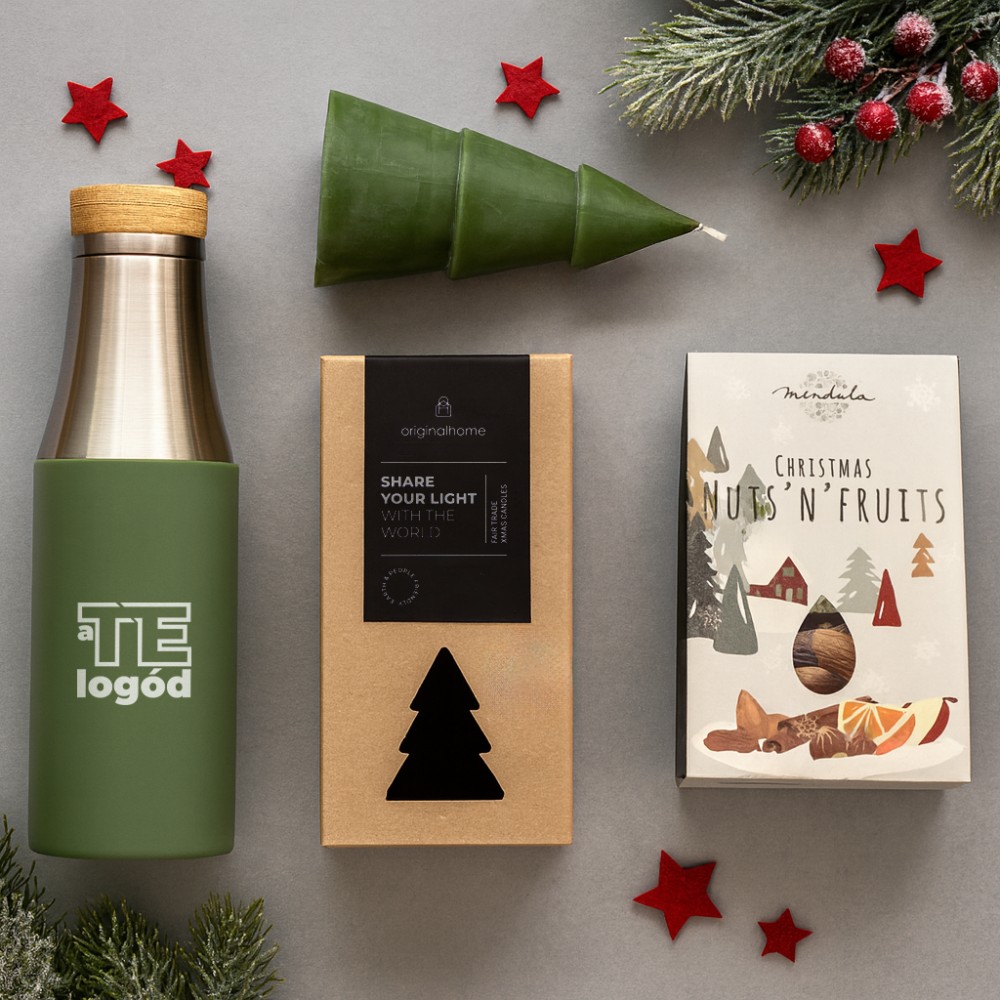 A természet szerelmeseinek szóló összeállítás, amely egy téli sétához vagy kiránduláshoz nyújt tökéletes támogatást. A csomag tartalma: Xmas mag- és szárítottgyümölcs mix, 120g (nan), illatmentes, fenyőfa alakú gyertya az Originalhome-tól, 100%-ban természetes és tanúsított pálmamagviaszból (12632562), réz-vákuumos palack, 540 ml (10066762). Csomagolási lehetőségekről érdeklődj ügyfélmenedzserednél! A kép illusztráció. A kínálatunkban szereplő termékek igény szerint kombinálhatók. A csomagot rendelés esetén állítjuk össze. Várható szállítási határidő: kb. 2 hét. A termékek emblémázását és csomagolását nem tartalmazza a csomag ára. A csomagban szereplő élelmiszer csak csomag részeként rendelhető.